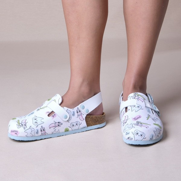 Zuecos de piel sintética con plantilla de corcho y estampado de motivos de enfermería