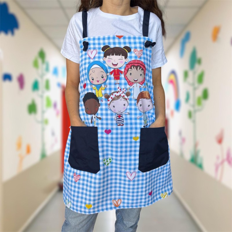 Comfortable and colorful apron-style tunic designed for teachers, educators, or classroom assistants.