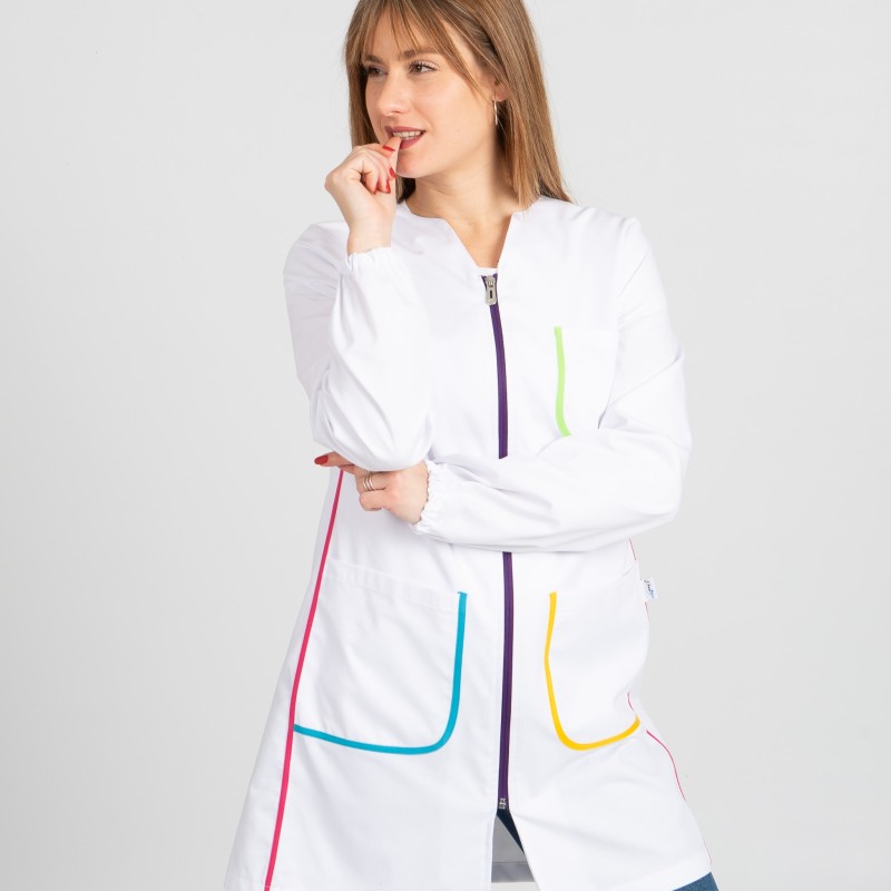Bata branca c/ vivos coloridos em aplicações no bolso